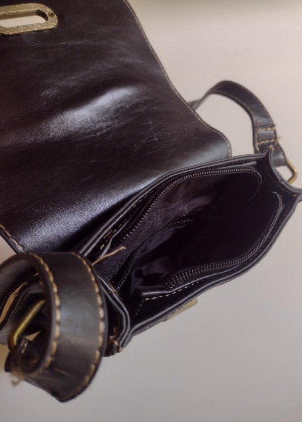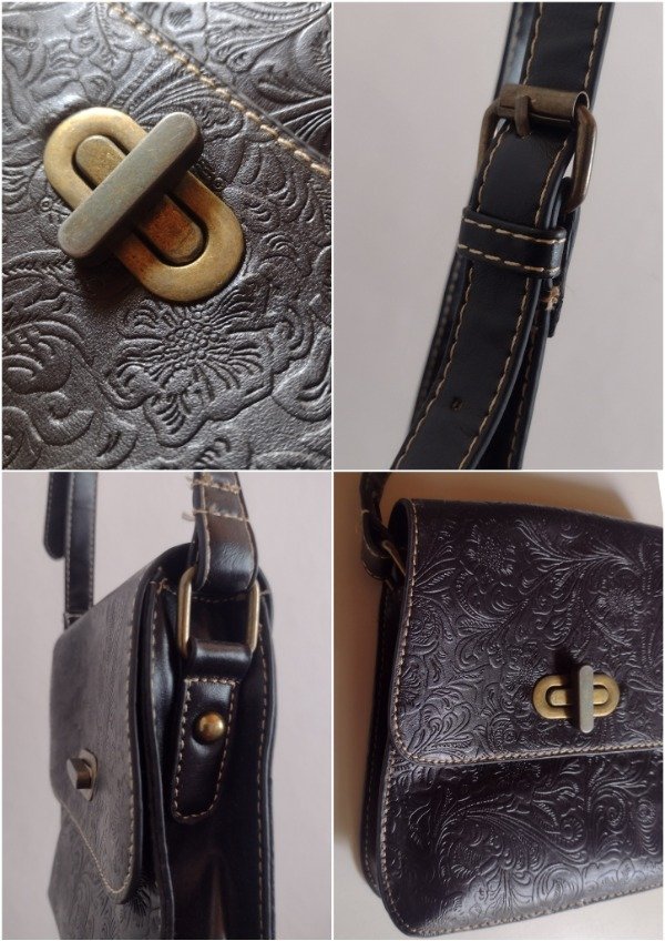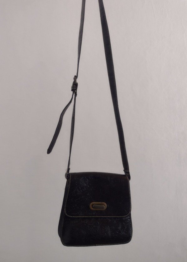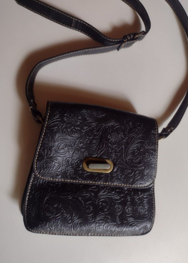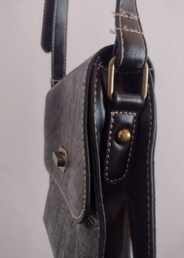 Bandolera vintage de cuero, color negro con detalle de labrados florales.