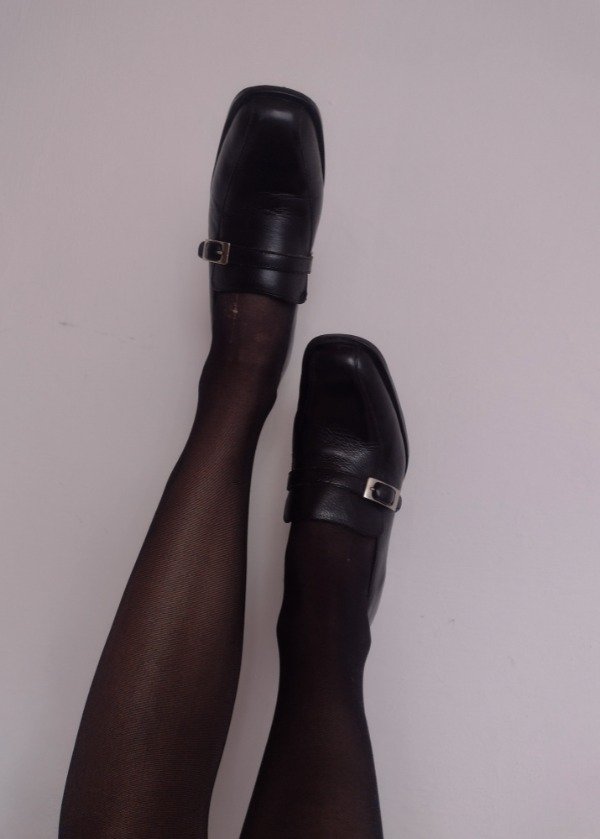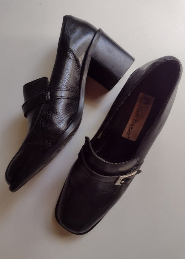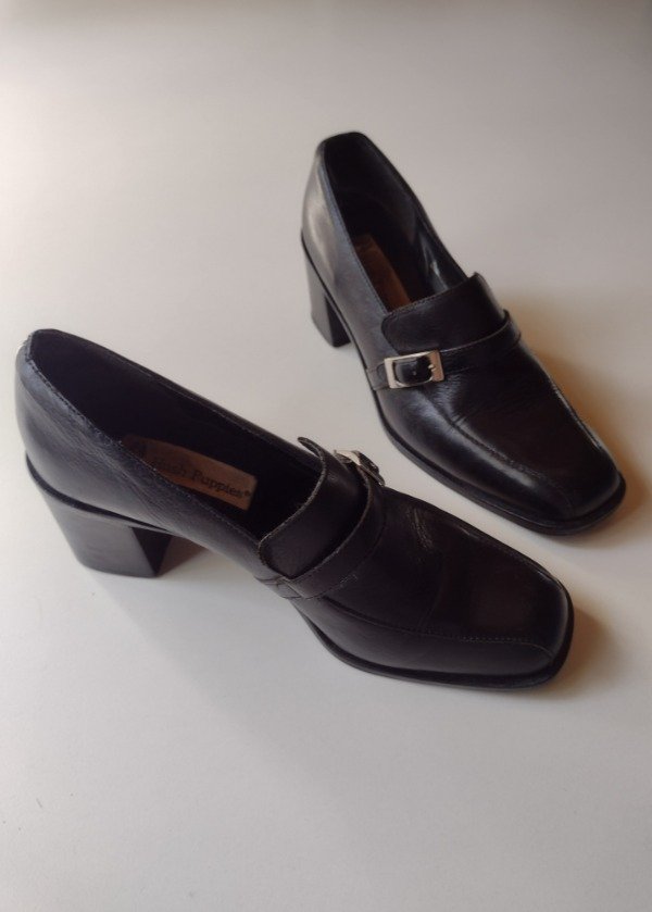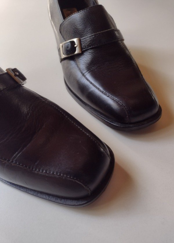 De punta cuadrada, taco mediano, ancho y detalle de hebilla en la parte superior.