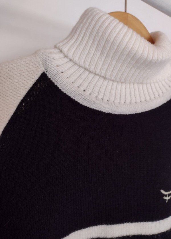 Polera de hilo marca Kosiuko combinada en colores negro y blanco, con bordado de la marca en la parte superior.