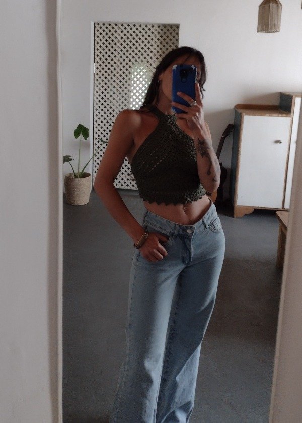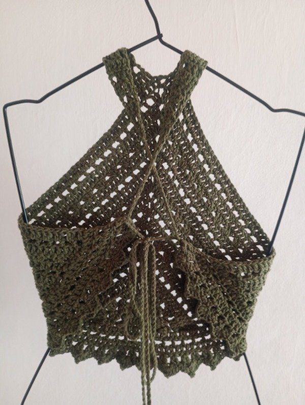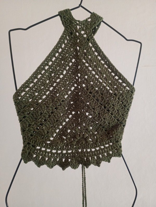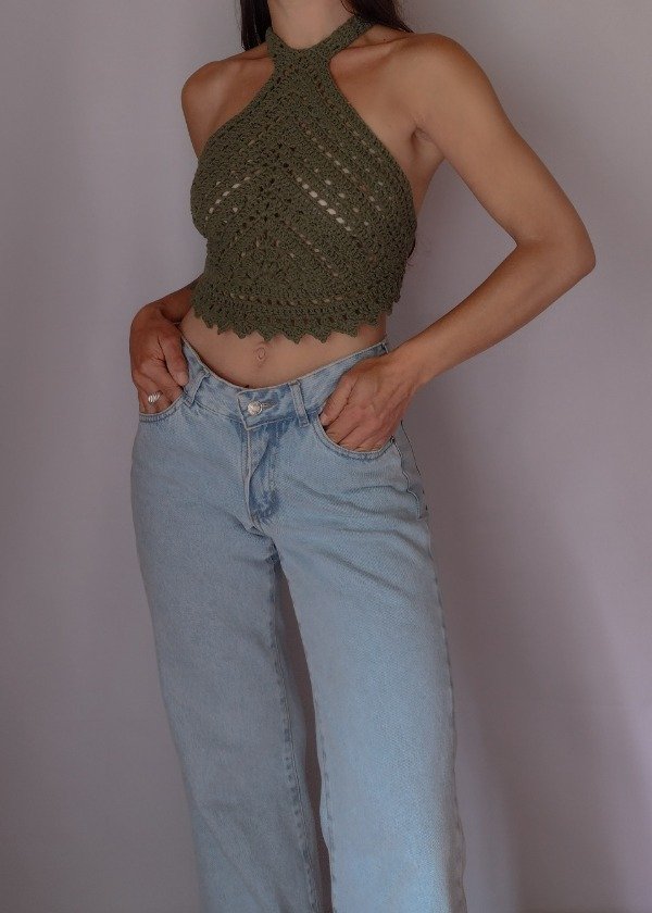 Top de hilo de algodón tejido a mano, color verde musgo.