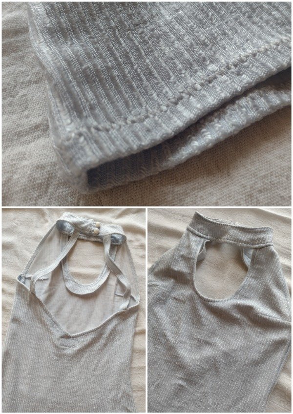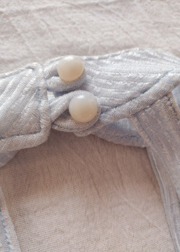 Detalle de escote descubierto y acceso trasero por botones en el cuello.